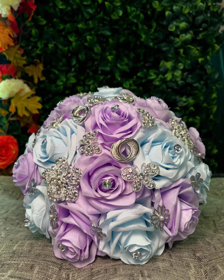 Float into your special day with our "Pastel Dreams" bouquet, where soft lavender and powder blue roses create a heavenly harmony. Each handcrafted bloom is complemented by sparkling silver crystal brooches and elegant ring accents, creating a romantic keepsake that captures the dreamy essence of your celebration. Perfect for the bride or quinceañera who envisions a magical day filled with soft, romantic colors and timeless elegance.
